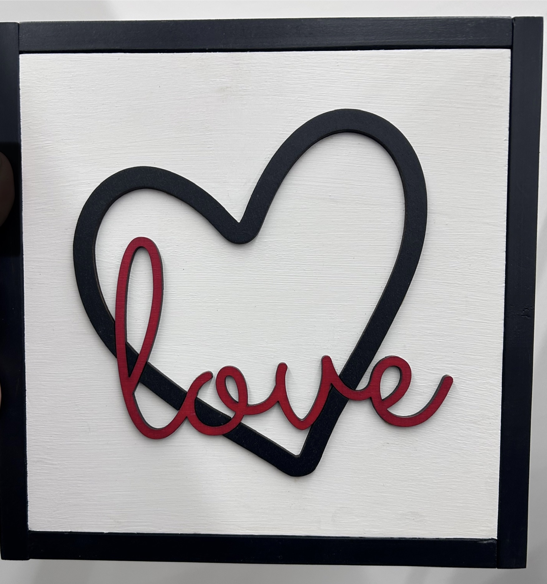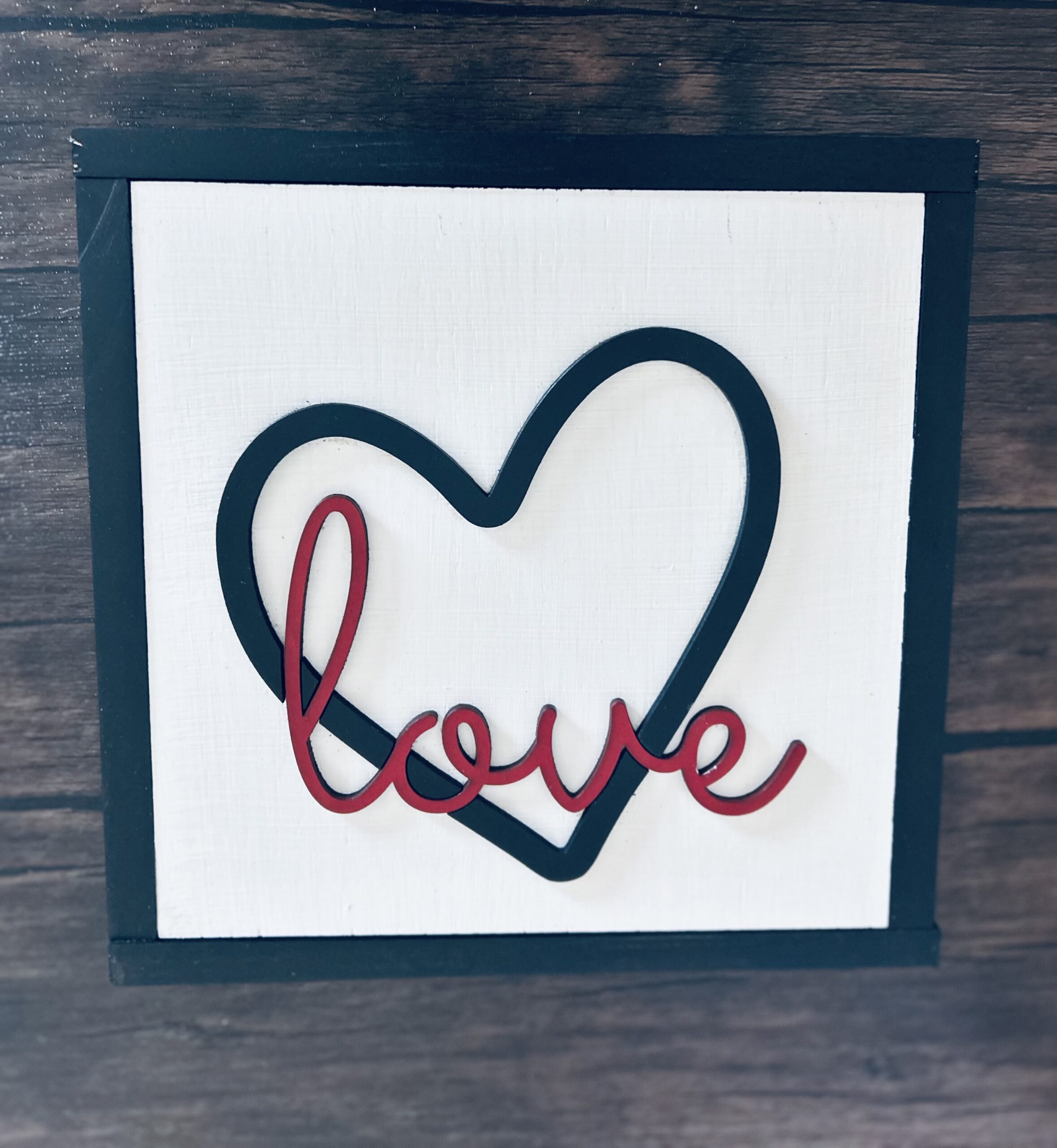 This charming, handcrafted sign is designed to add a touch of rustic warmth to any space. Measuring 8 inches square, it features a three-dimensional design set within a classic black, farm-style wooden frame. The central decoration includes a prominent heart motif and the word “love,” making it a perfect accent piece for a gallery wall, shelf, or mantelpiece.