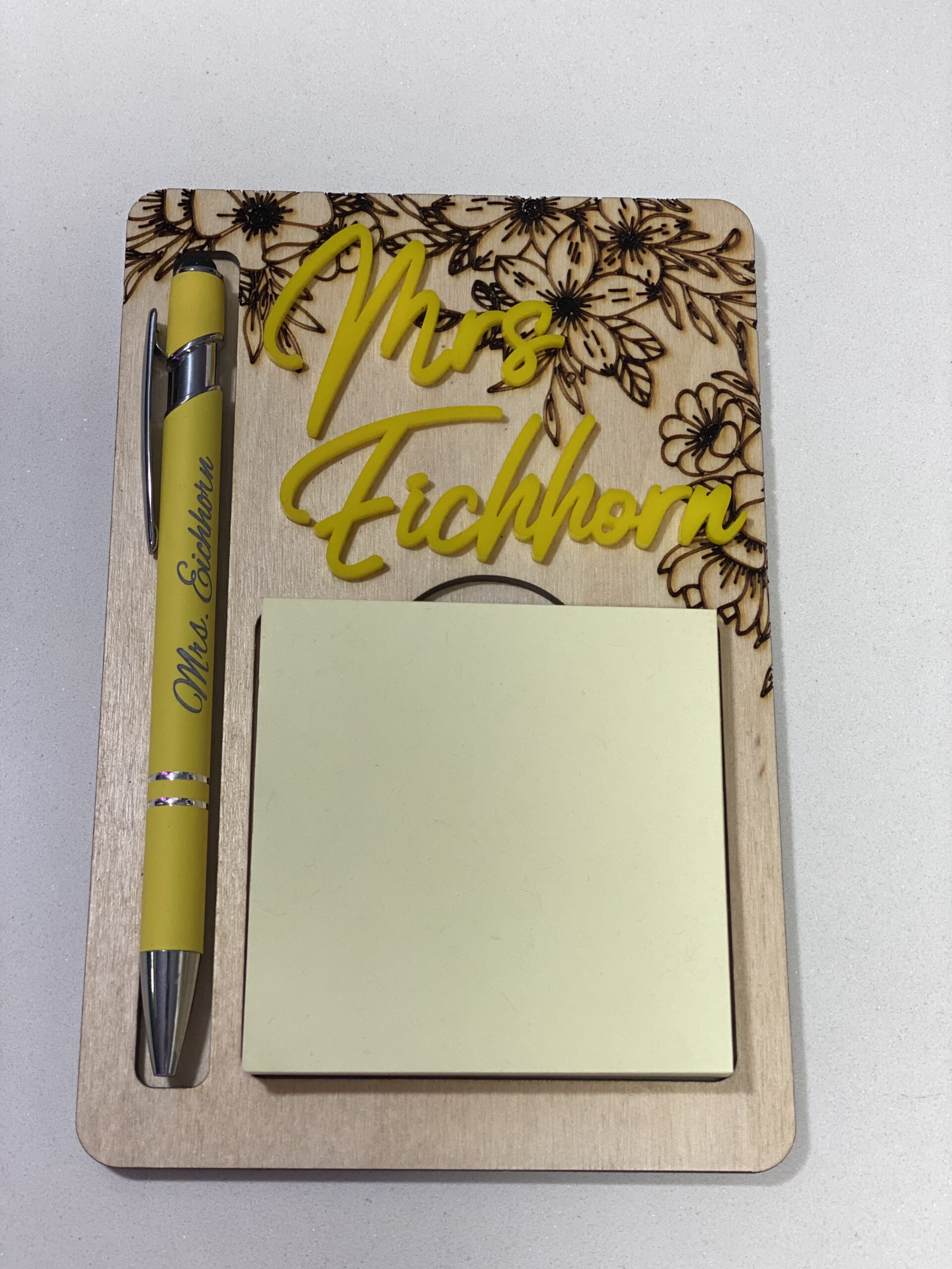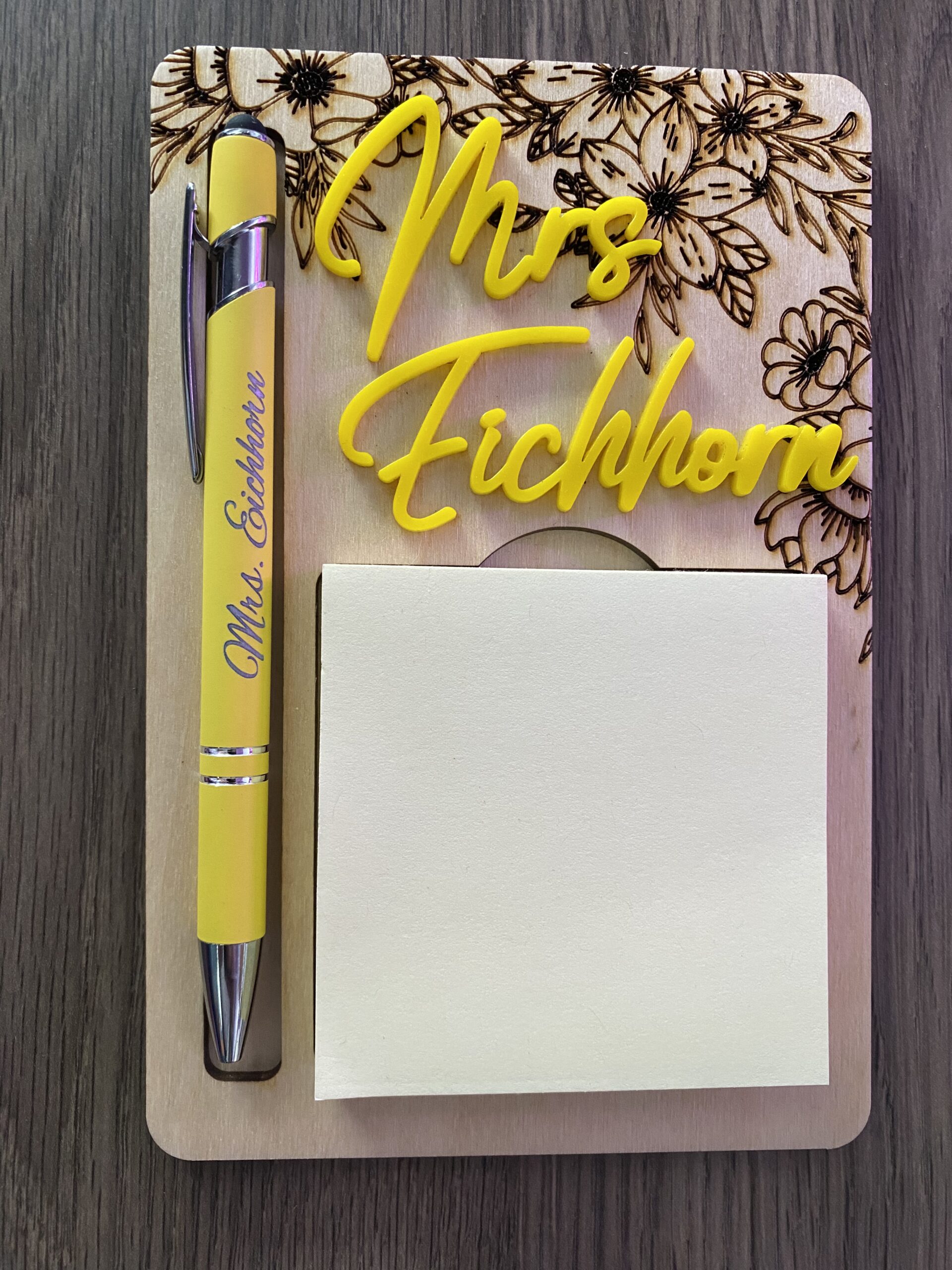 The perfect personalized gift for teachers! 🌸✨ This beautifully engraved wooden sticky notepad and pen holder features a floral design, custom acrylic name, and comes with a matching engraved pen and sticky notes. Ideal for teacher appreciation, end-of-year gifts, or Christmas! 🎁