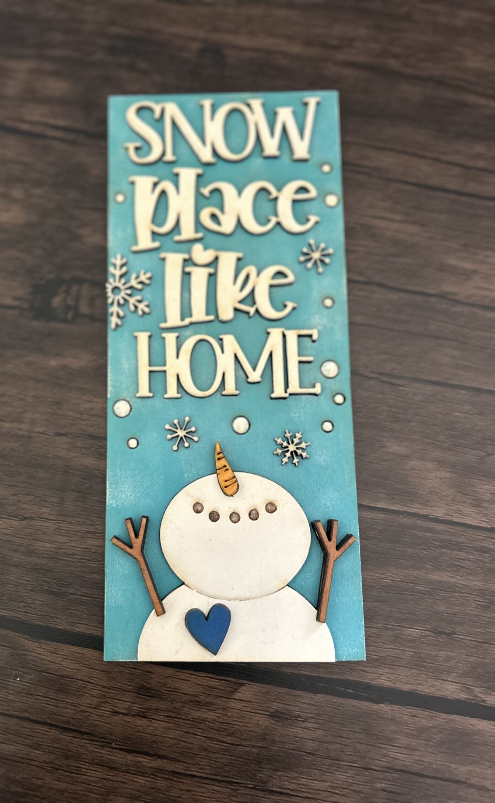 Bring a touch of winter wonder to your space with this 9.5″ x 4″ 3D wood sign. Featuring the playful pun “Snow Place Like Home,” the design is accented by a charming laser-cut snowman and delicate 3D snowflakes for added depth and texture. Its compact size makes it an ideal choice for tiered trays, mantels, or cozy shelf displays throughout the winter season.